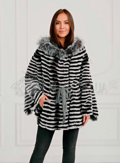 Меховое пальто 70 см пошито из шерстяной основы и украшено полосами натурального меха кролика, капюшон выполнен из чернобурой лисицы. Красивая и легкая вещь дополнит меховой гардероб девушек уже имеющих шубку.